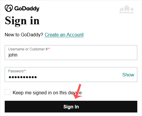 2. Enter the Username or Customer ID and the password of your GoDaddy account. Then click on Sign In.