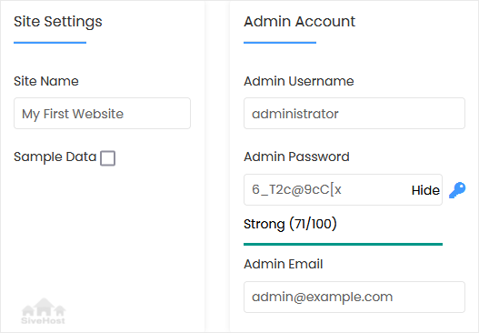 • Admin Username: Your new Concretecms username (for security reasons, do not use the administrator or the admin username).