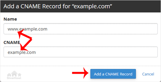 4. Click on CNAME Record, and a popup box will open. Please, enter the required details in it.